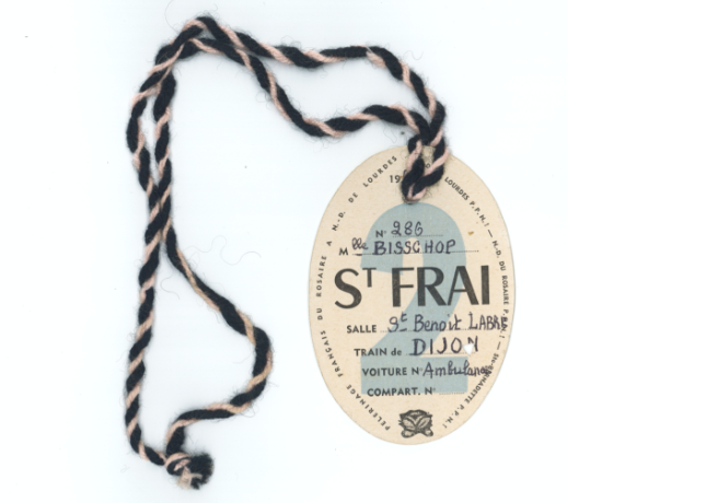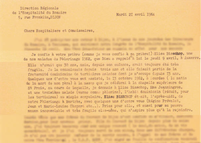 “Je confie à votre prière (comme je vous confie à sa prière !) Elise Bisschop, une de nos malades du Pèlerinage 1962.”