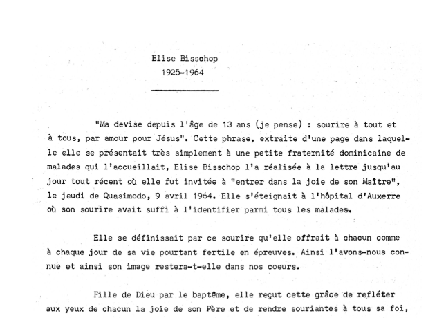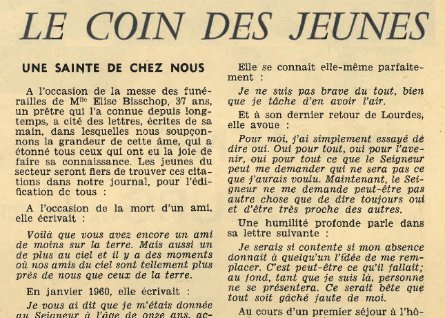 “À l’occasion de la messe des funérailles de Mlle Élise Bisschop, 38 ans, un prêtre qui l’a connue depuis longtemps a cité des lettres écrites de sa main.”