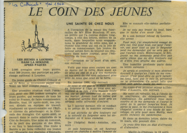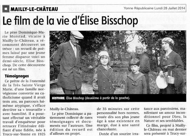 Juin 2010, une plus jeune amie, Marcelle, ayant su l’intérêt pour Élise, apporte au presbytère l’article de Châtel-Censoir ; elle l’avait précieusement conservé.