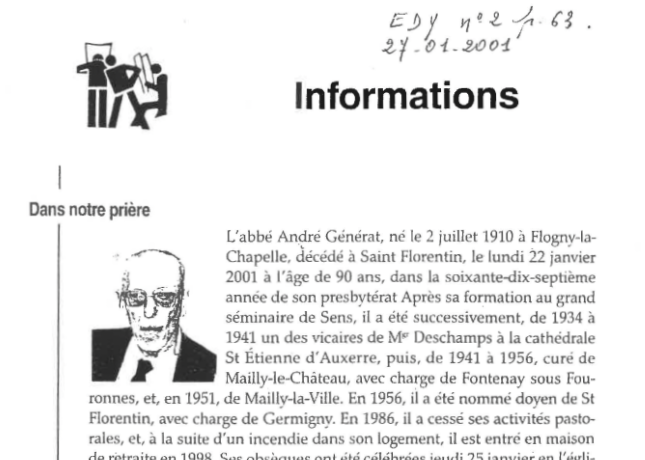 Quand l’abbé Générat est nommé à Saint-Florentin en 1957, l’abbé Pierre Van Ede de Châtel-Censoir vient aider la paroisse en difficulté.