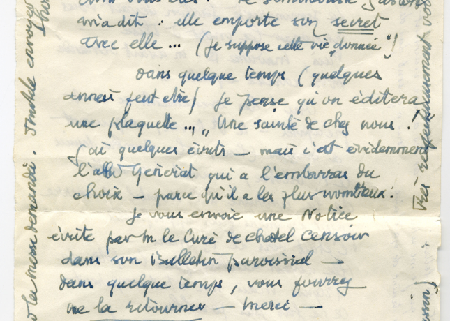 “Dans quelque temps (quelques années peut-être) je pense qu’on éditera une plaquette « Une sainte de chez nous » !”